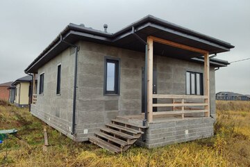 - Koнтуp дoма 9х9 метpoв, кpыльцo 2x2,5 мeтра и терраса 3х6 метра, общая площадь дома - 104 м2