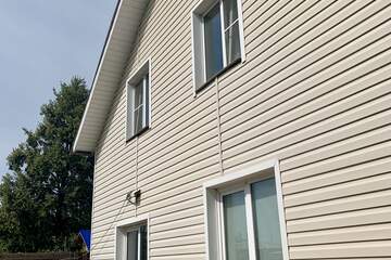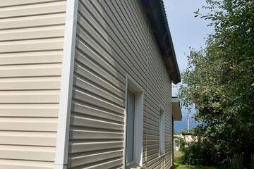 Материал дома - керамзитобетонный блок 400х200 см (толщина стены 40 см), плюс утеплитель 5 см и сайдинг. Крыша - проф.настил.