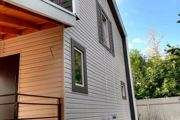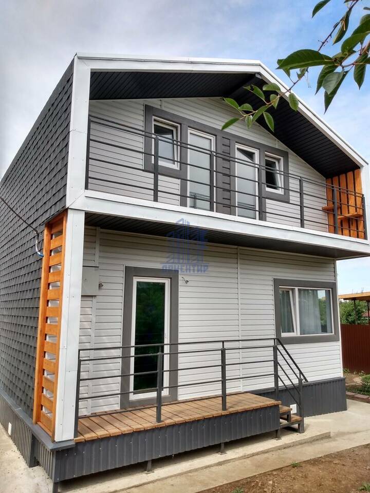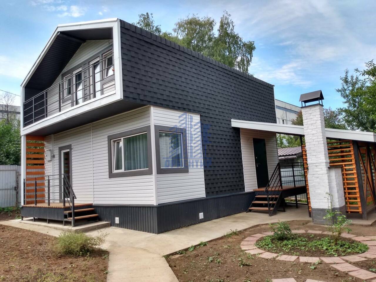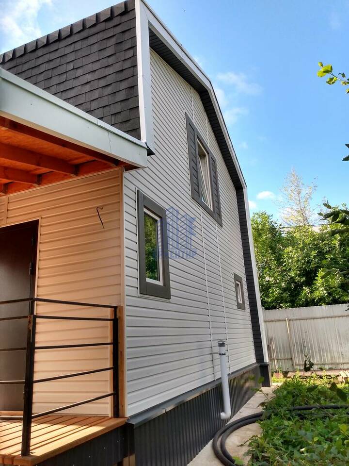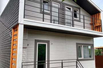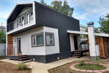 Конструктивная особенность дома: Фундамент ж/б свайный с ростверком, стены, перекрытия и покрытие каркасно- панельные заводского исполнения (СИП 174 - 224 мм). Кровельное покрытие – мягкая черепица. Окна ПВХ, тройное остекление. Наружная отделка – сайдинг. Два крыльца, балкон, беседка с камином. За домом забетонирована площадка под хозяйственное помещения 20м2 (возможности не ограничены: мастерская, сауна, бассейн, зимний сад, комната для гостей...).