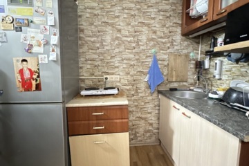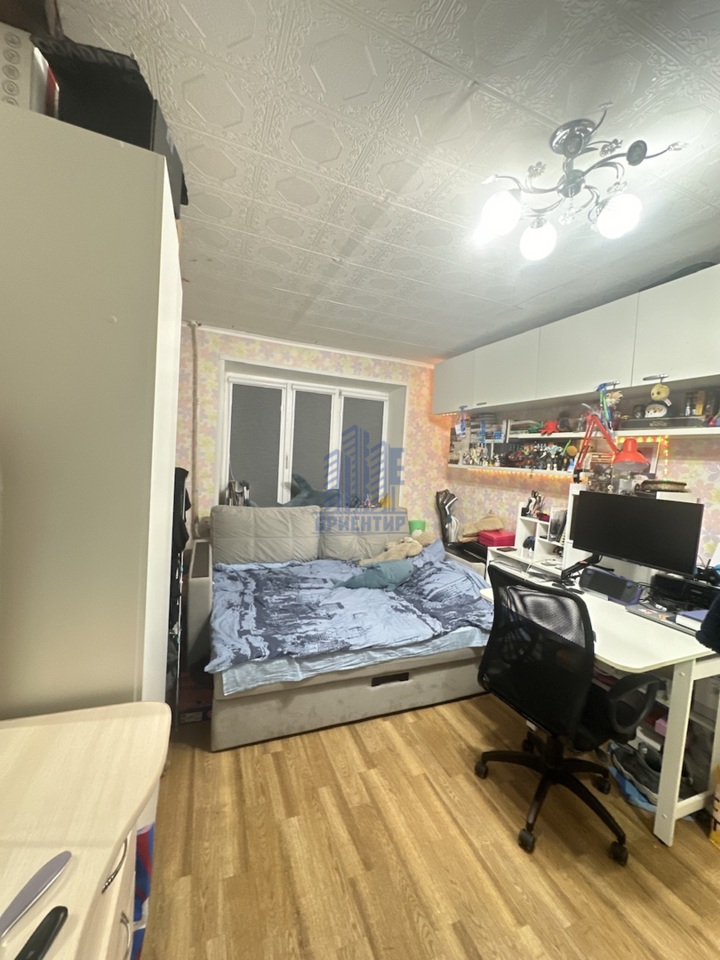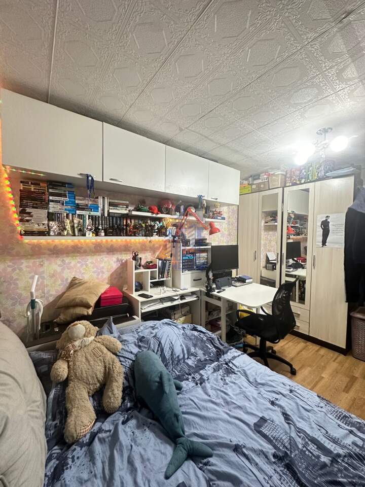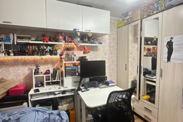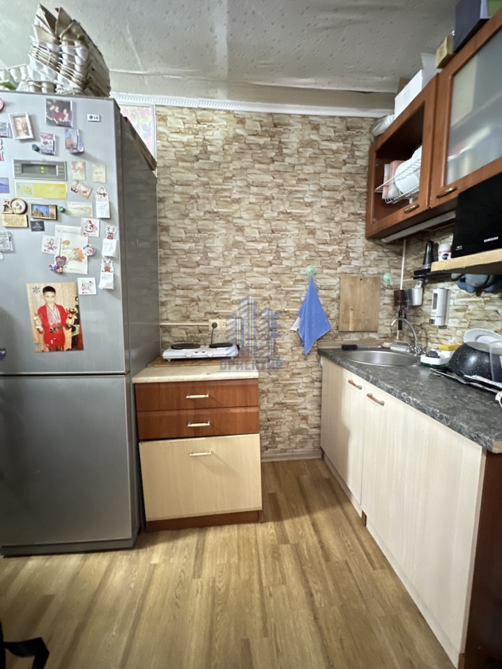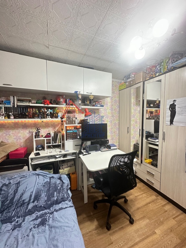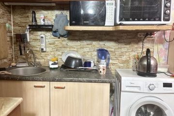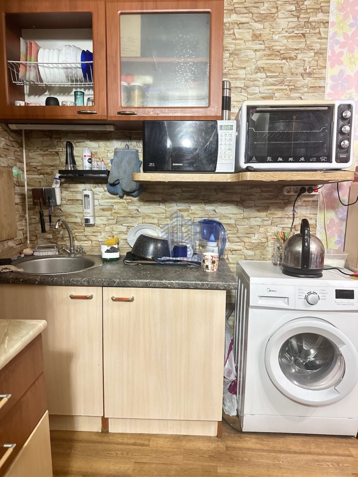 В комнате остается кухонный гарнитур, комод, шкаф, компьютерный стол, из техники: духовая мини-печь, телевизор , подключенная стиральная машинка.