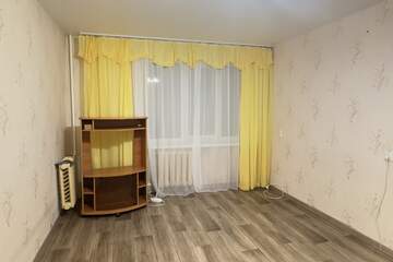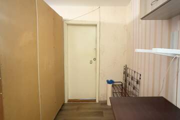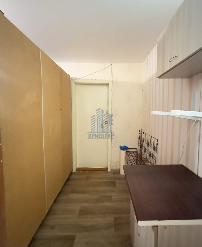 В комнате пластиковое окно, на полу линолеум, светлые обои, металическая дверь. Есть место под стиральную машинку, остается шкаф и полочки.