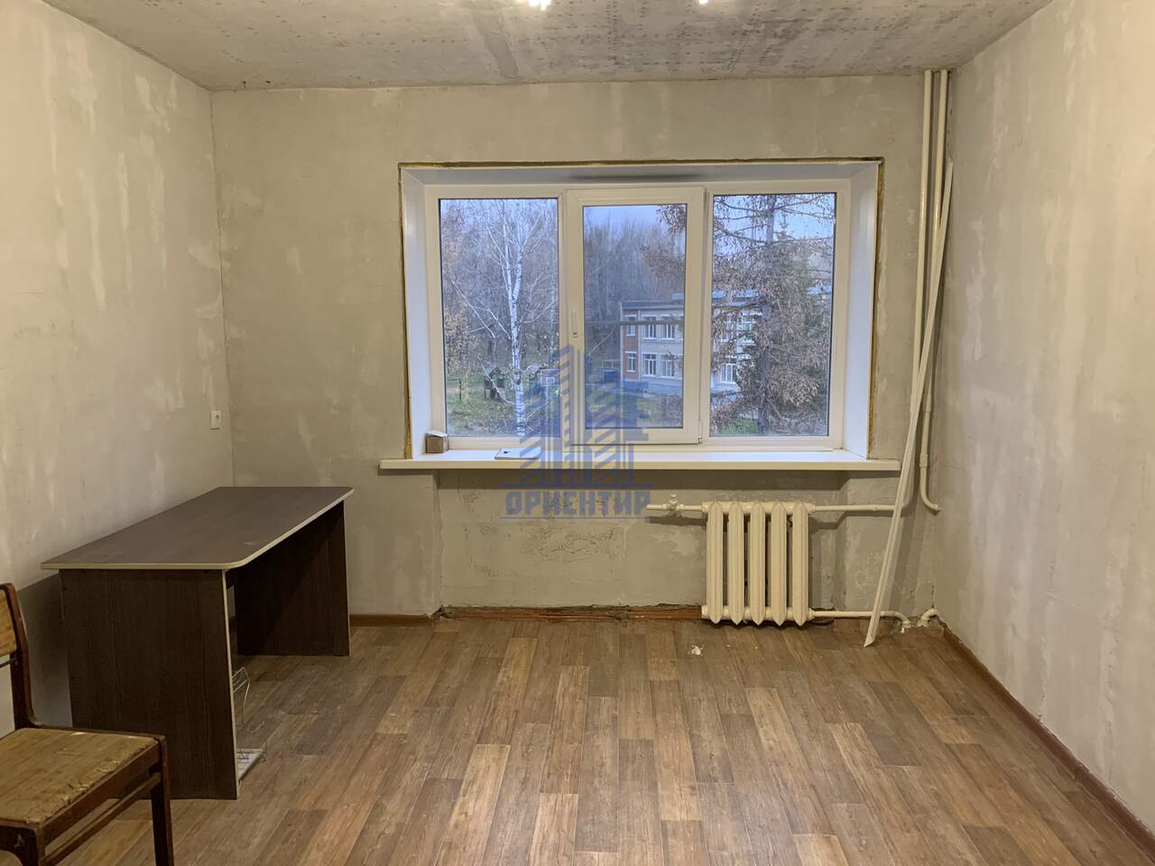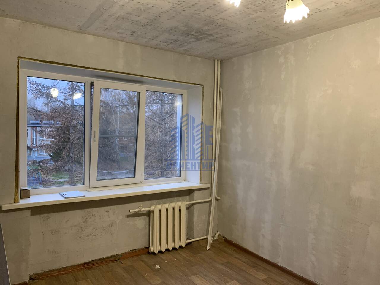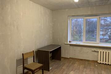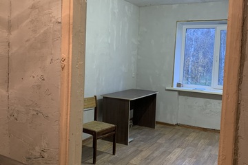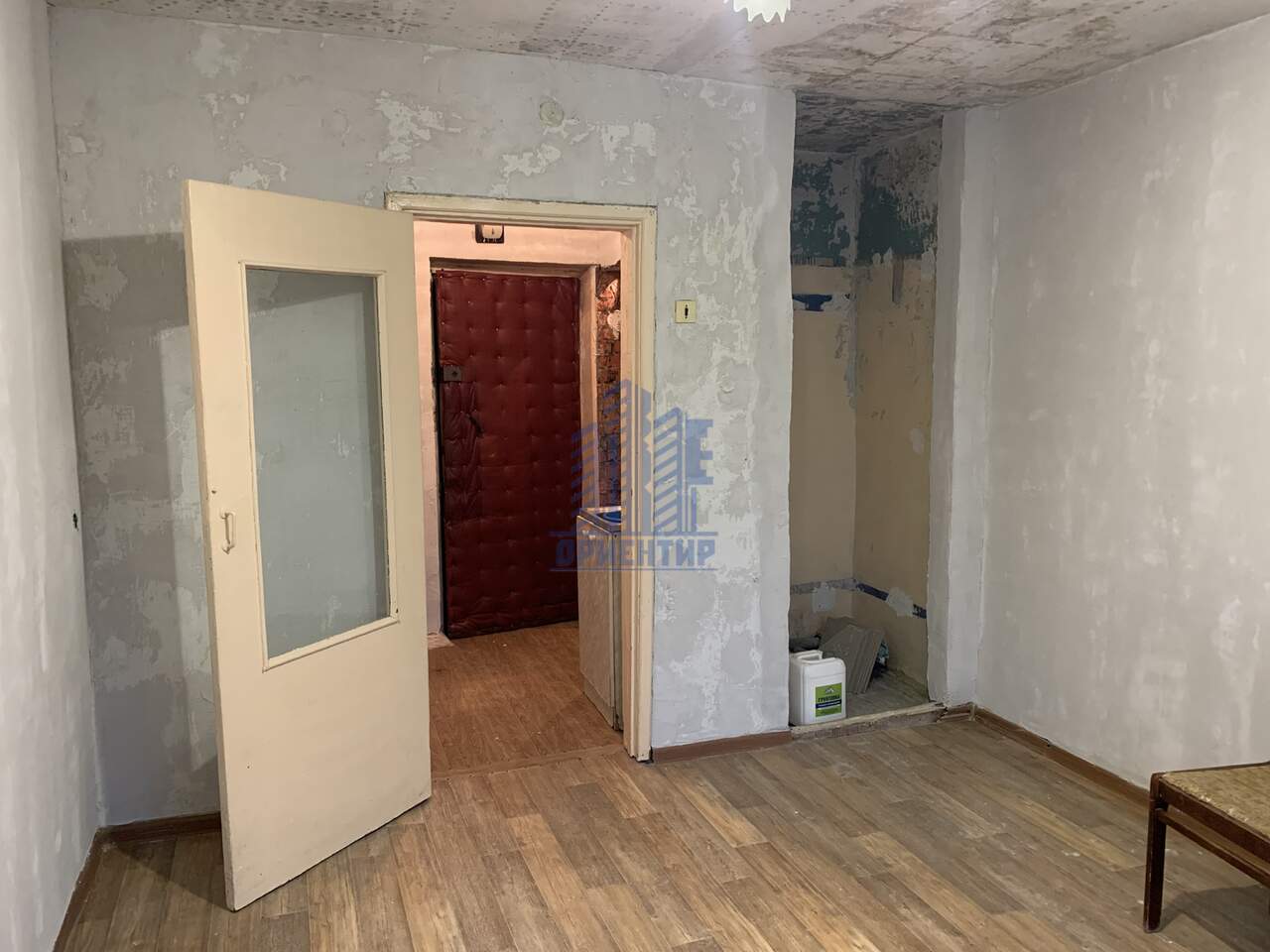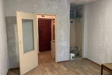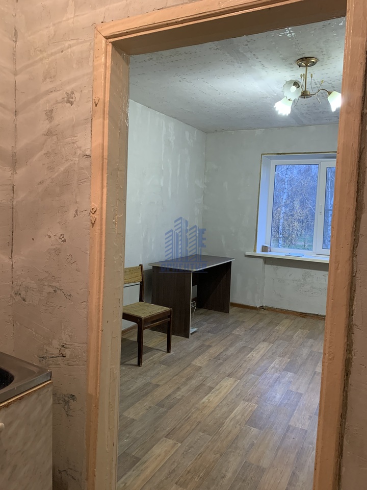 Комната разделена на туалет, будущую душевую, кухню, коридор и жилую комнату (12,8 кв.м). Частично постелен линолеум.