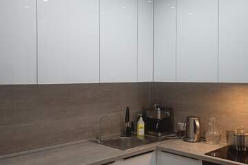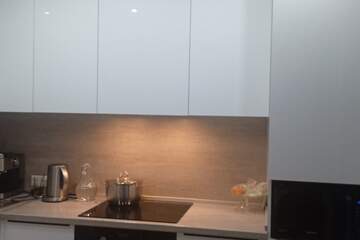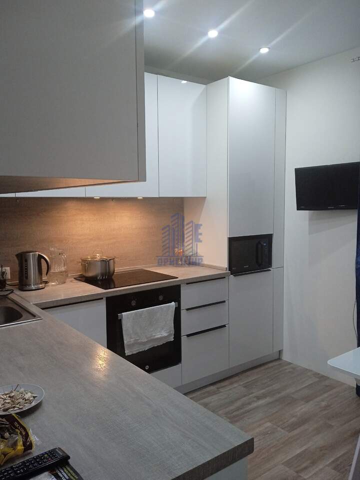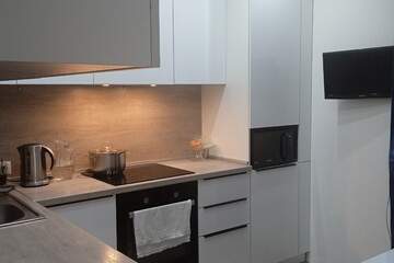 - Кухонный гарнитур с встроенным холодильником, духовым шкафом и варочной панелью.