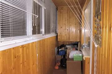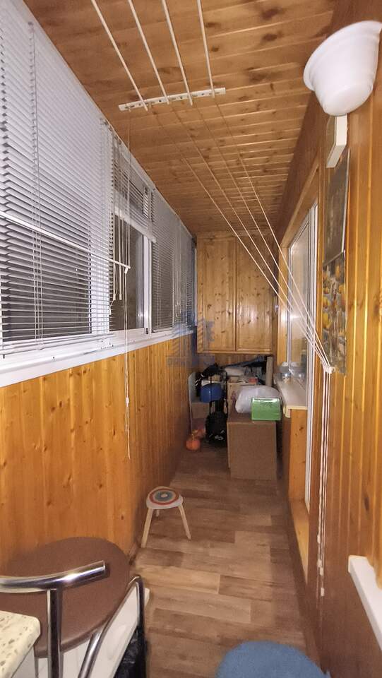 ✅ Просторный балкон застеклён и аккуратно отделан деревянной вагонкой, создавая дополнительное пространство для отдыха и хранения вещей.