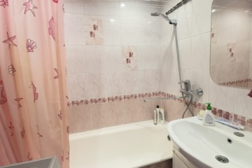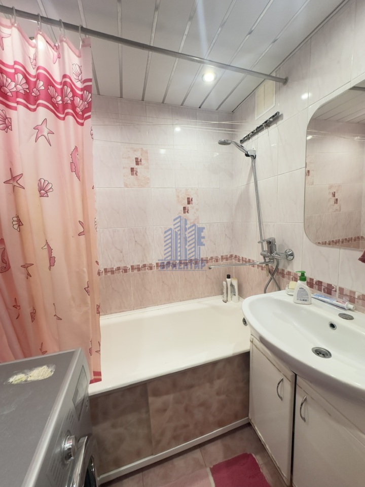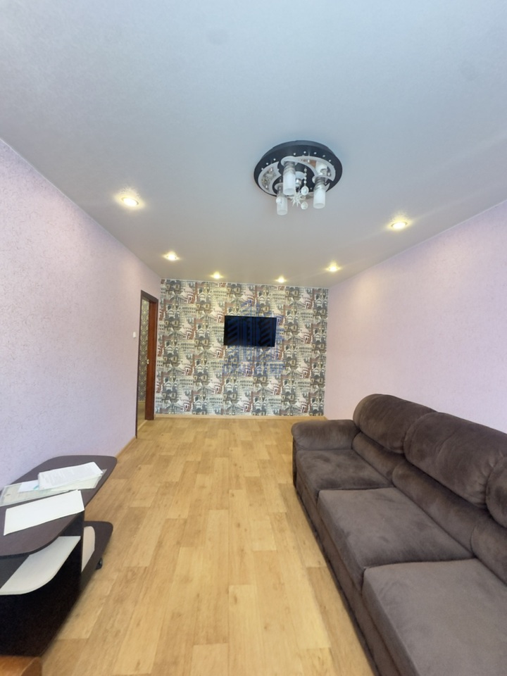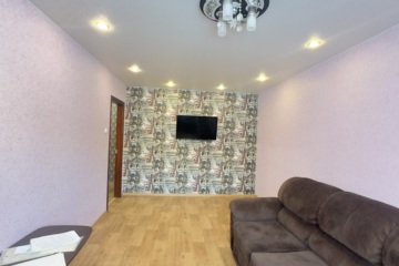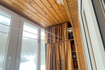 В квартире установлены пластиковое остекление, балкон обшит утеплителем и вагонкой, потолки натяжные, на полу линолеум под ламинат, в санузлах плитка.