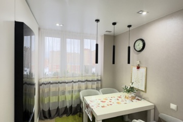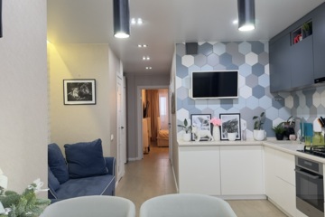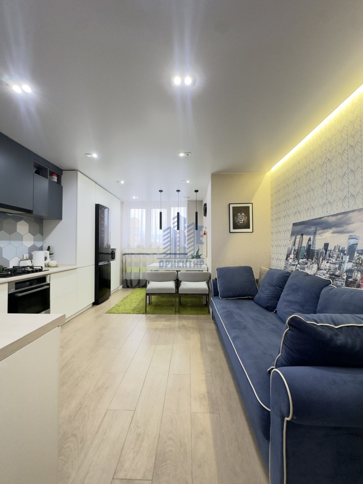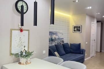 Просторный зал 20 кв. м. с отдельной рабочей зоной, кухня-гостиная 17 кв.м. с обеденной зоной и зоной отдыха, большая спальная комната 17 кв.м., также в квартире есть небольшое кладовое помещение.