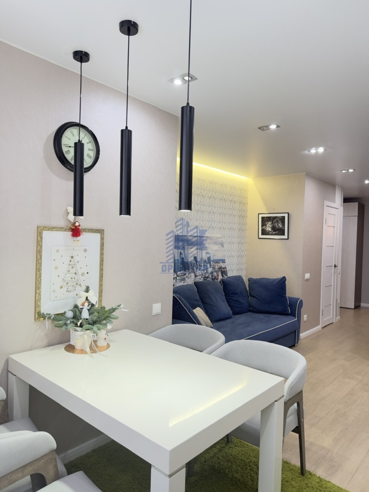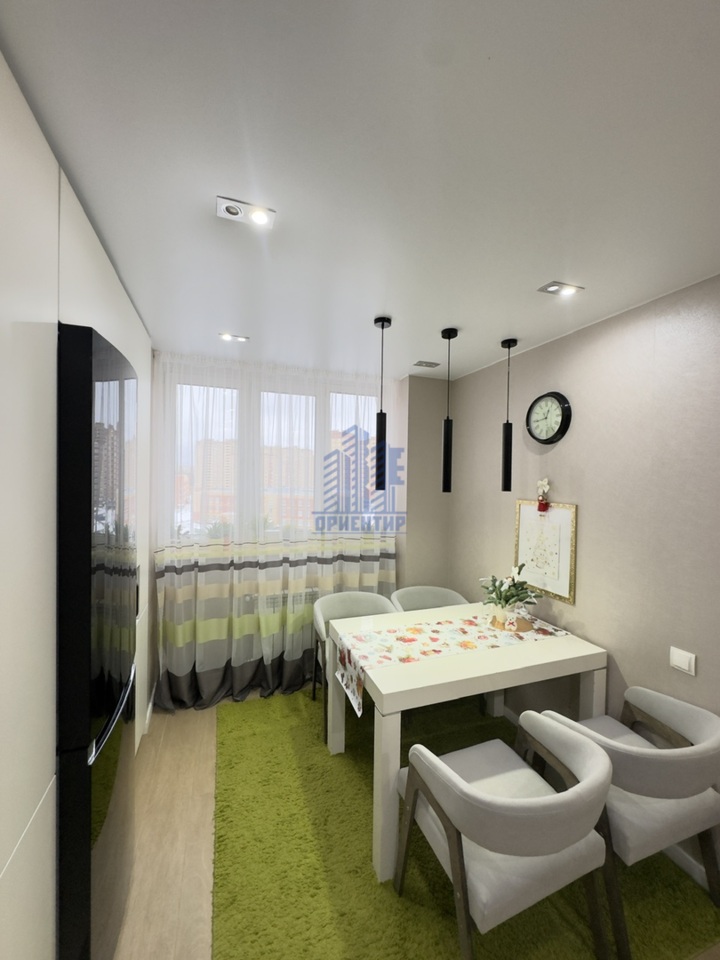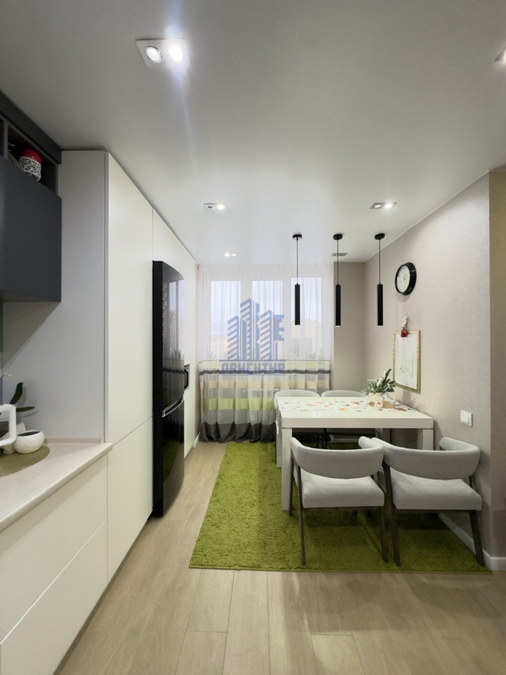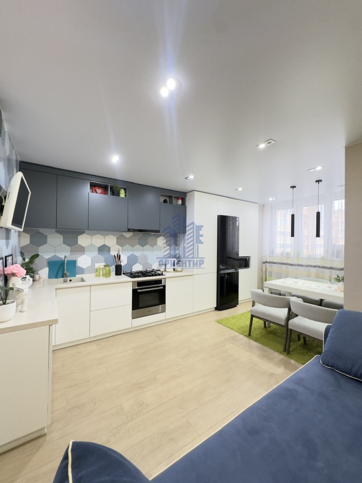 В зоне прихожей, кухне и ванной сделан теплый пол водный ( не электро) из керамогранита под ламинат, зона зала и спальной ламинат, на стенах качественные дорогие обои, натяжные потолки со светильниками.