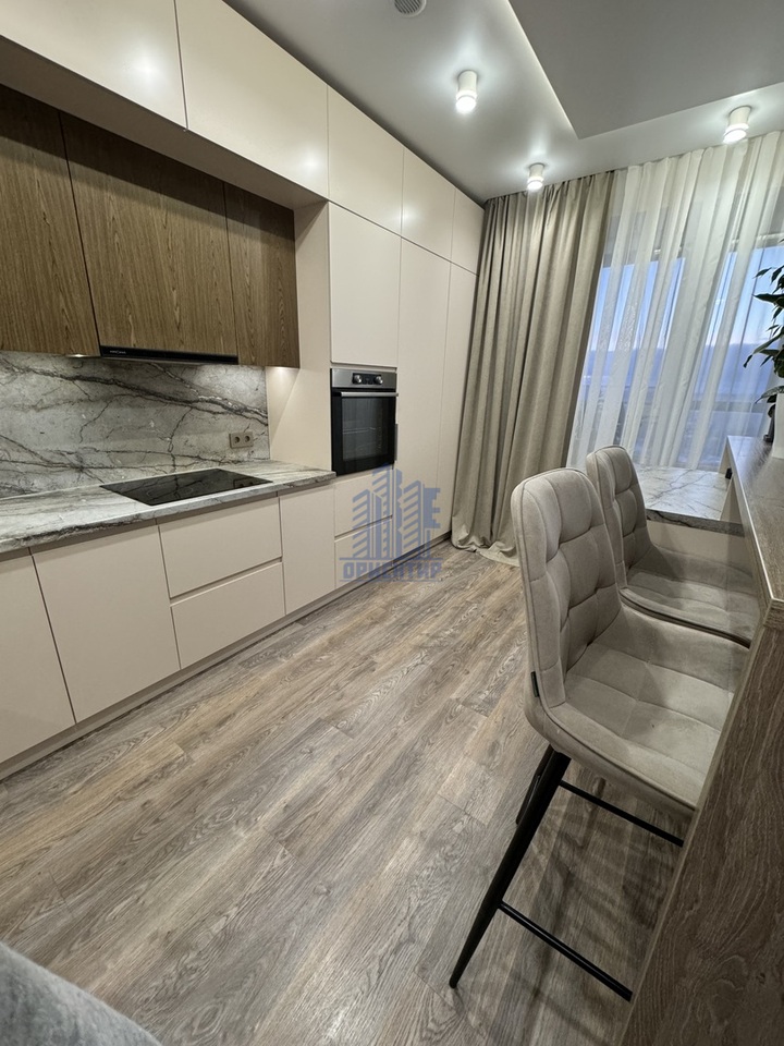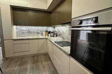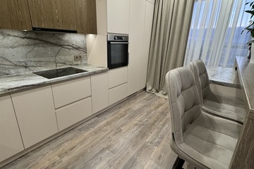 - Современная техника: Вся встраиваемая техника включает варочную панель, духовой шкаф, холодильник, отдельную морозильную камеру и посудомоечную машину — все, что нужно для комфортного проживания.