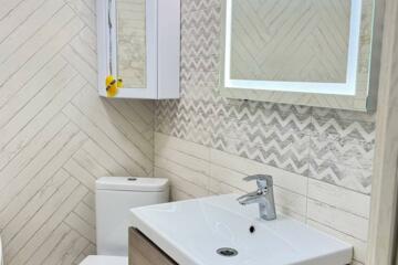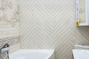 Ванная комната выполнена в современном стиле, два санузла, в квартире водный теплый пол, выложен керамогранит из белой глины. В прихожей предусмотрены вместительные шкафы для хранения вещей.